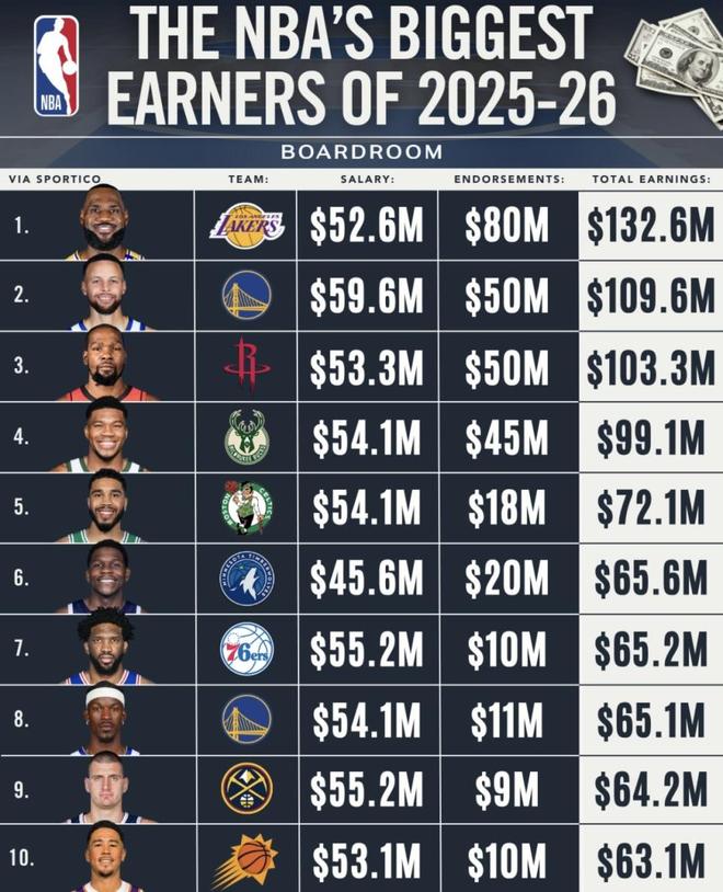 2025—26赛季的NBA收入榜揭示了一个残酷真相:真正拉开球星阶级差距的早就不是合同,而是场外的生意。